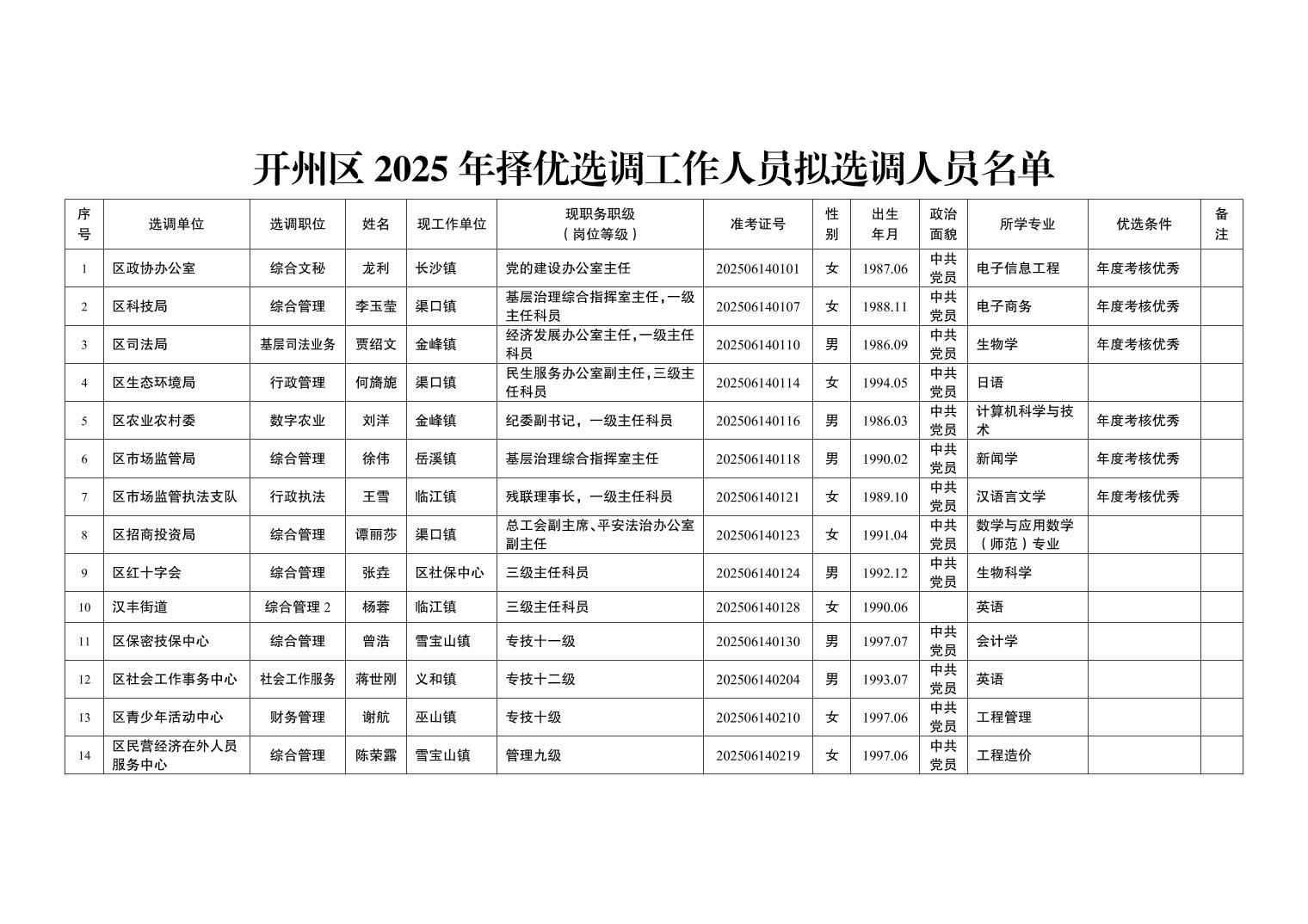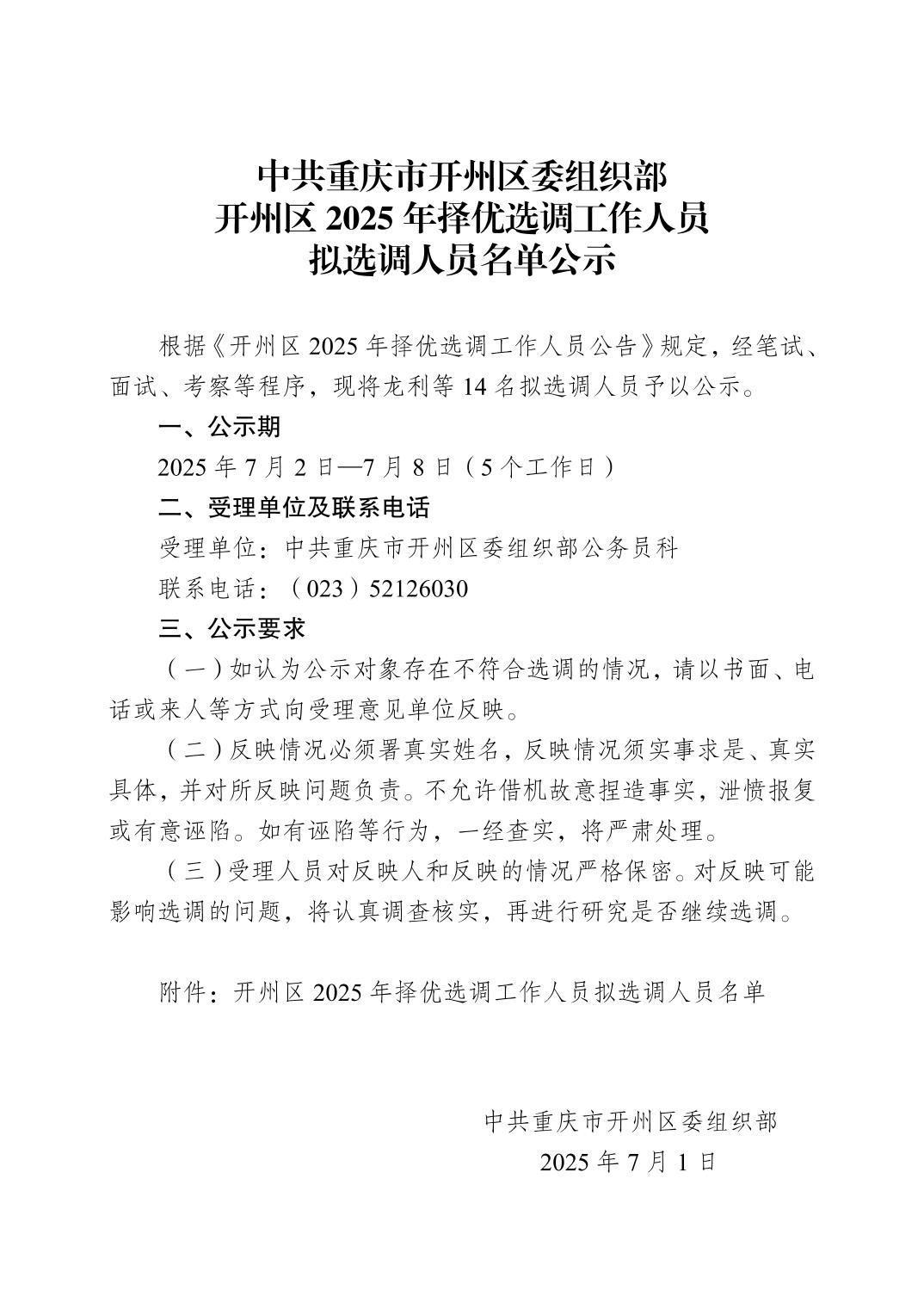 开州区2025年择优选调工作人员拟选调人员名单公示